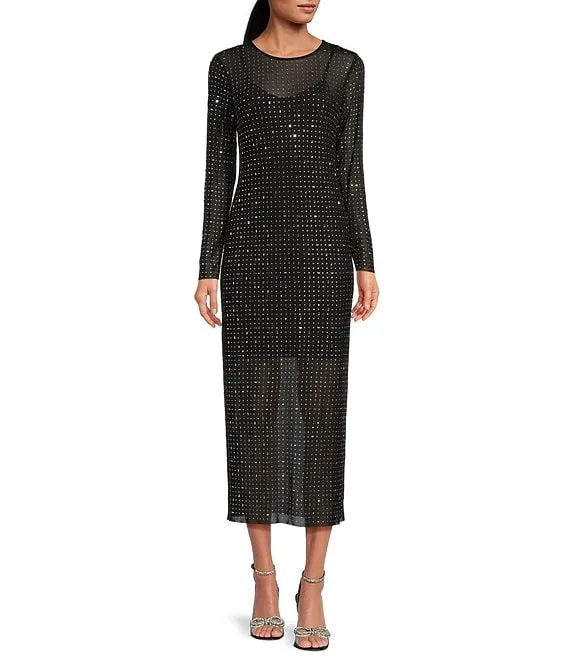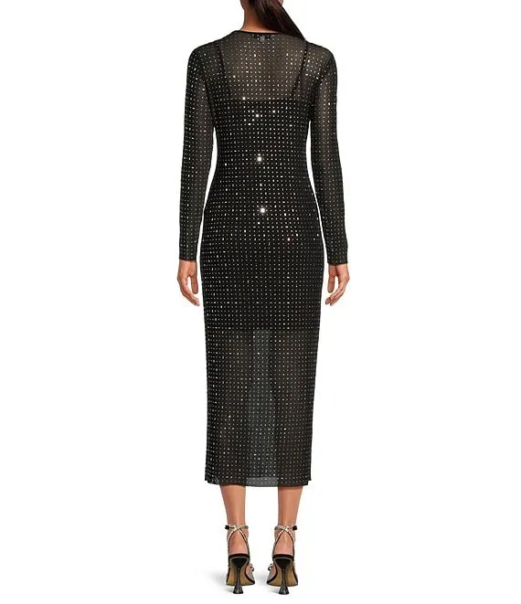 Tilly Rhinestone Mesh Crew Neck Long Sleeve Sheath Dress