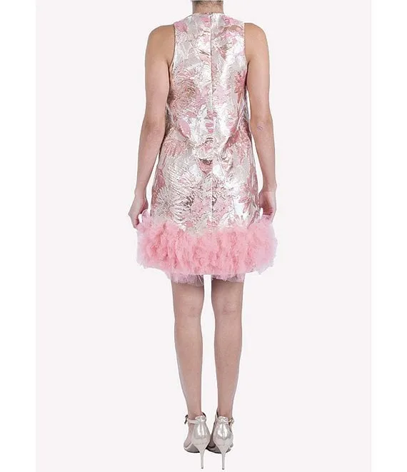 Metallic Jacquard Floral Print Sleeveless Crew Neck Tulle Hem Embellished Shift Dress