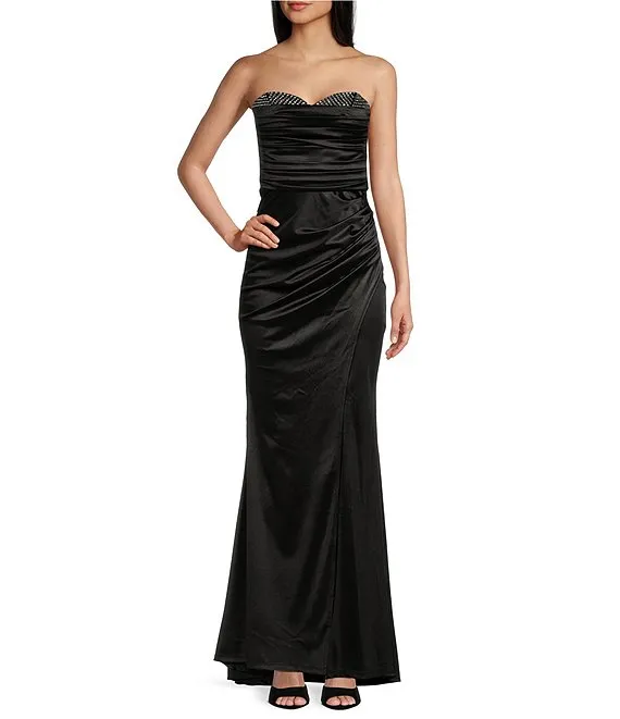 Strapless Rhinestone Pleated Bodice Front Slit Long Dress