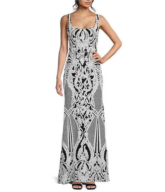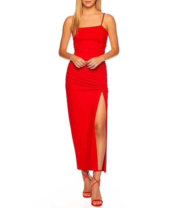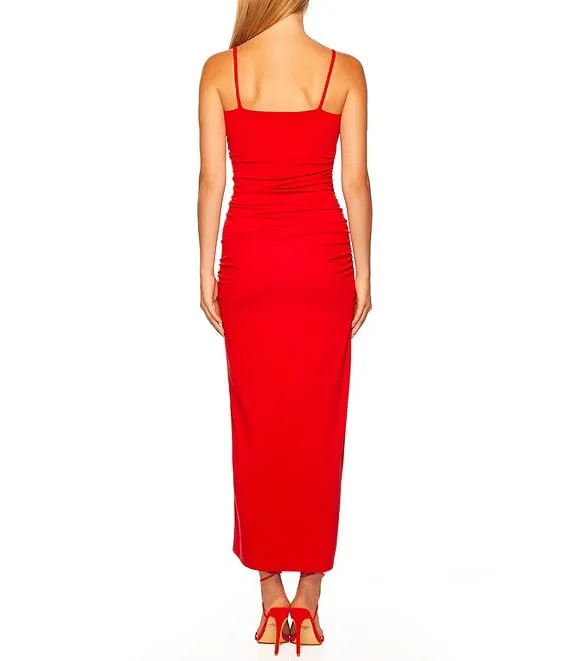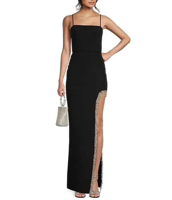 Spaghetti Strap Square Neck Side Slit Rhinestone Trim Dress