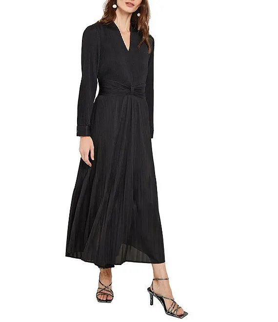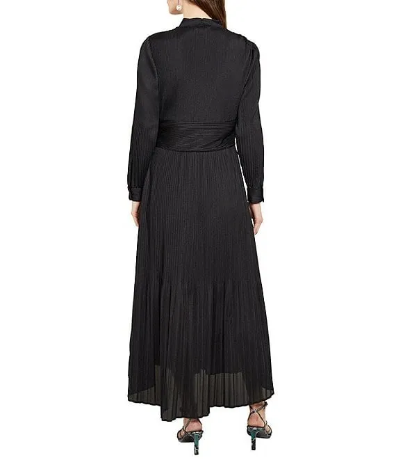 Plisse Pleated Woven V-Neck Long Sleeve A-Line Maxi Dress