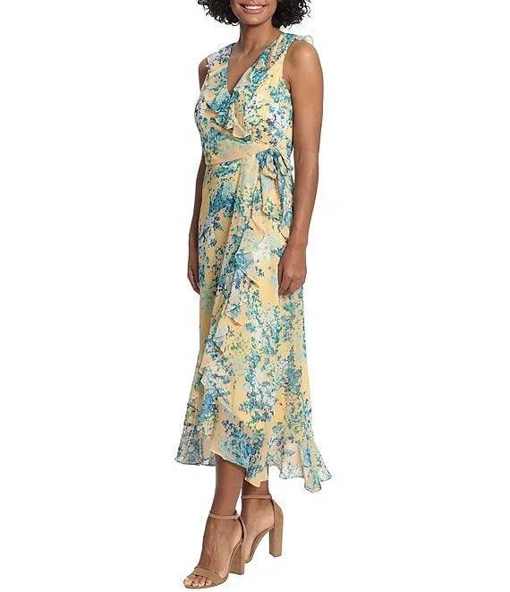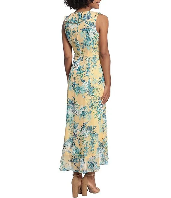Sleeveless V-Neck Tie Waist Cascade Ruffle Floral Maxi Dress