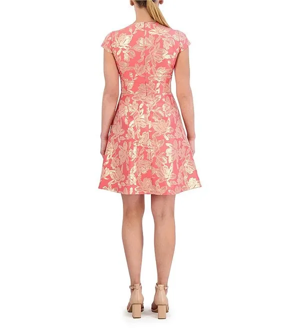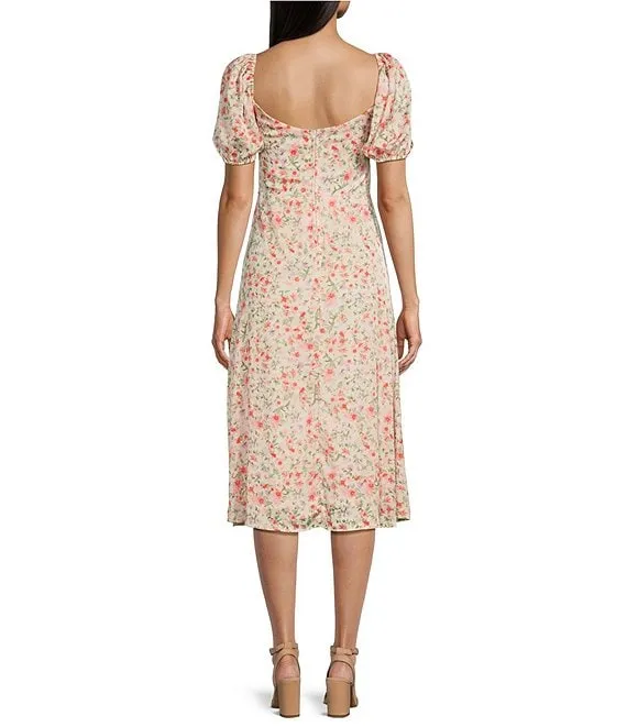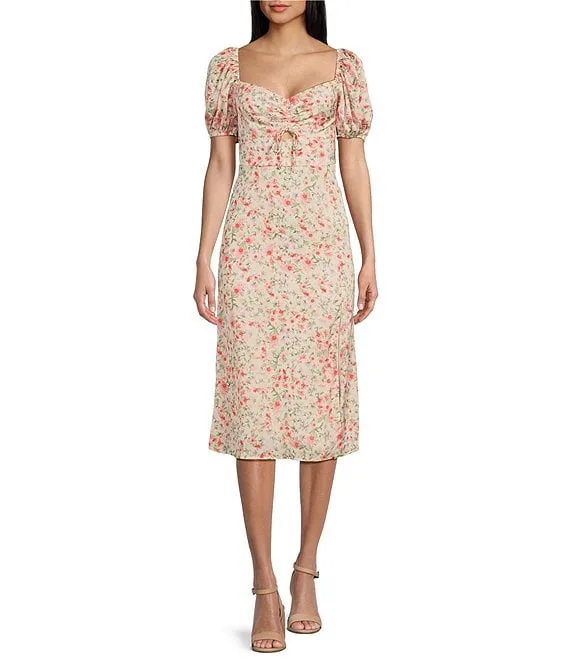 Floral Satin Jacquard Crepe Sweetheart Neck Tie Front Short Puff Sleeve Front Slit Midi Dress