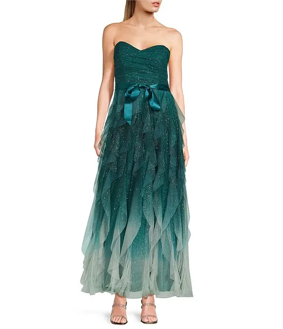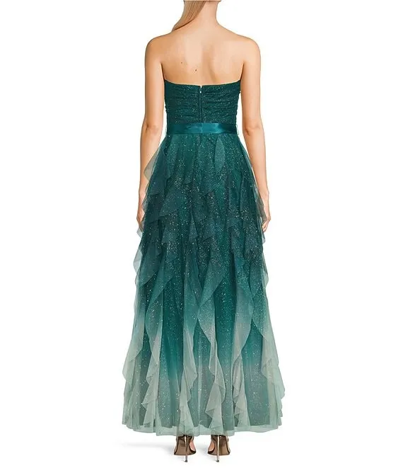 Strapless Glitter Ombre Mesh Ruffled Dress