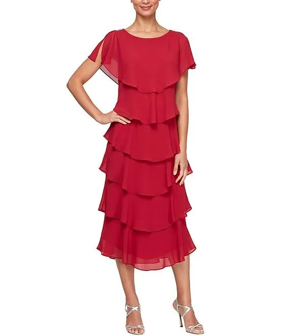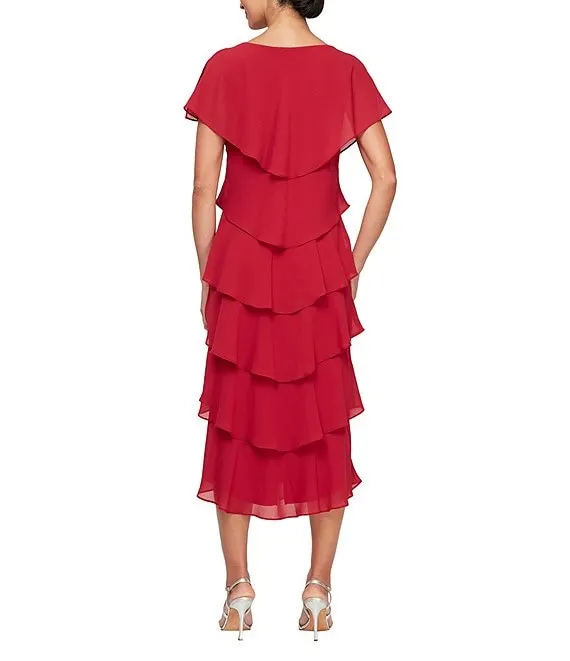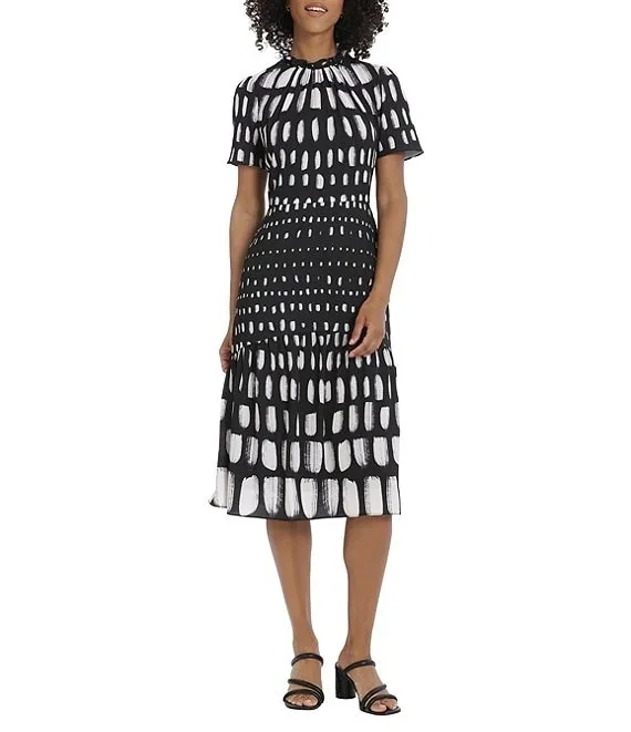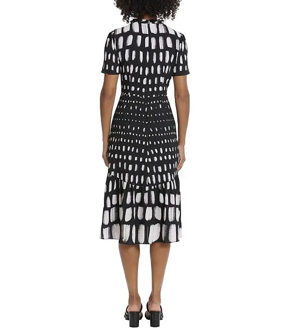 Printed Stretch Crepe Ruffle Mock Neckline Short Sleeve Tiered Midi Dress