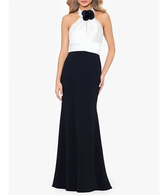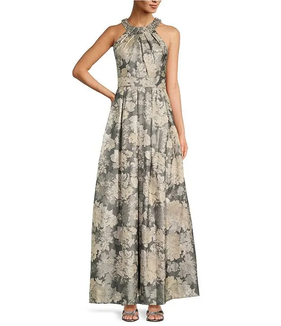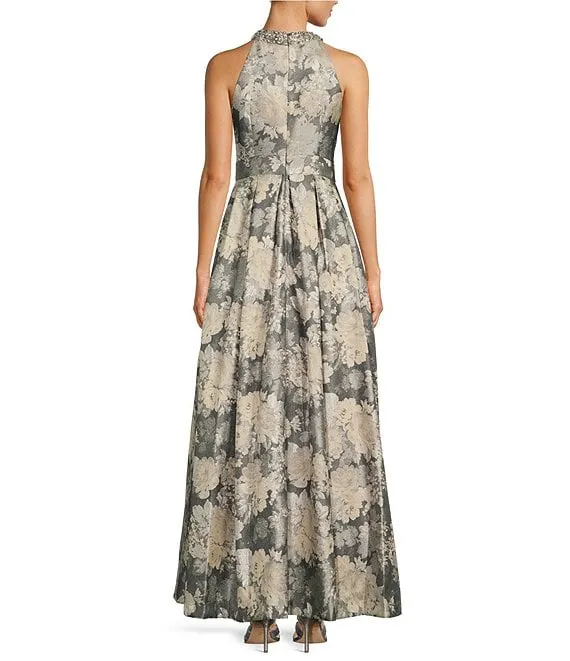 Floral Metallic Print Embellished Halter Neck Sleeveless Side Pocket Jacquard Ball Gown