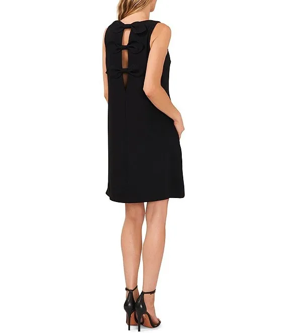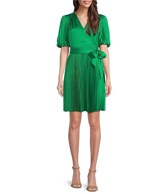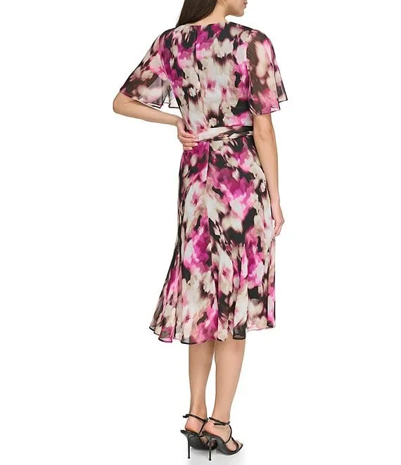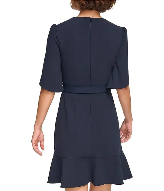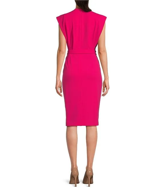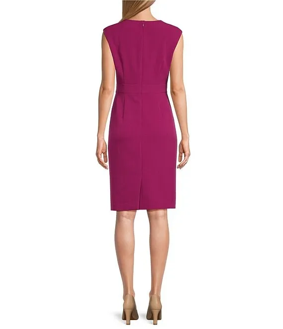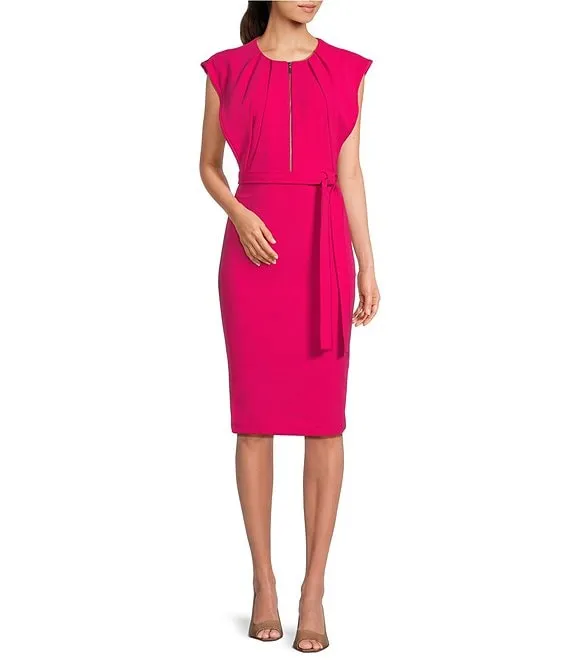 Calvin Klein Scuba Crepe Cap Sleeve Pleated Crew Neck Tie Waist Knee Length Dress