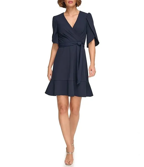 Stretch Crepe Jersey Surplice V Neckline 3/4 Tulip Sleeve Dress