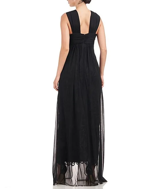 Beaded Embroidery V-Neck Sleeveless Mesh Drape Overlay A-Line Gown
