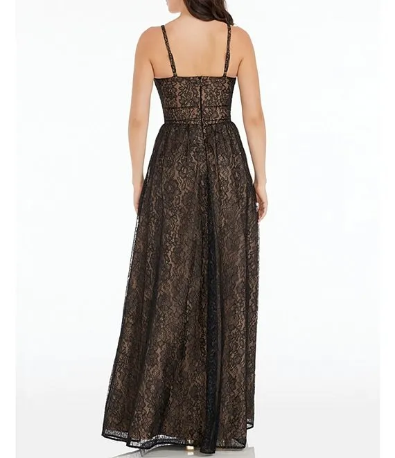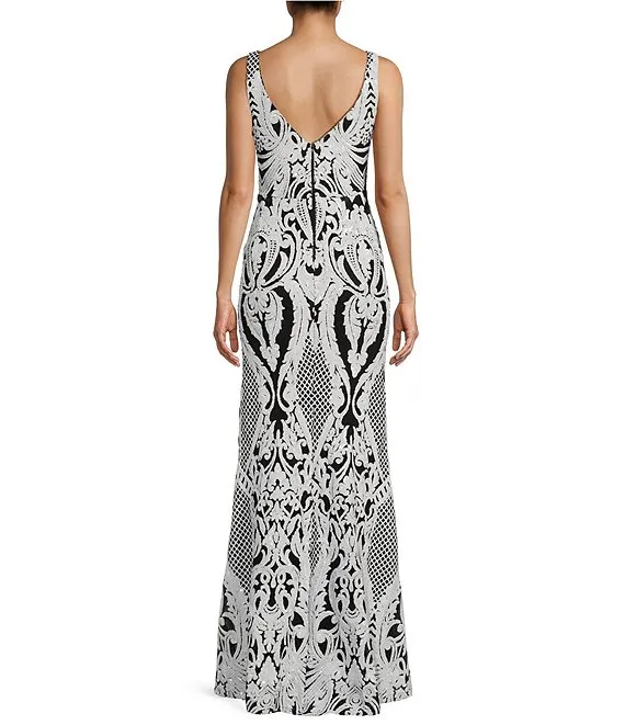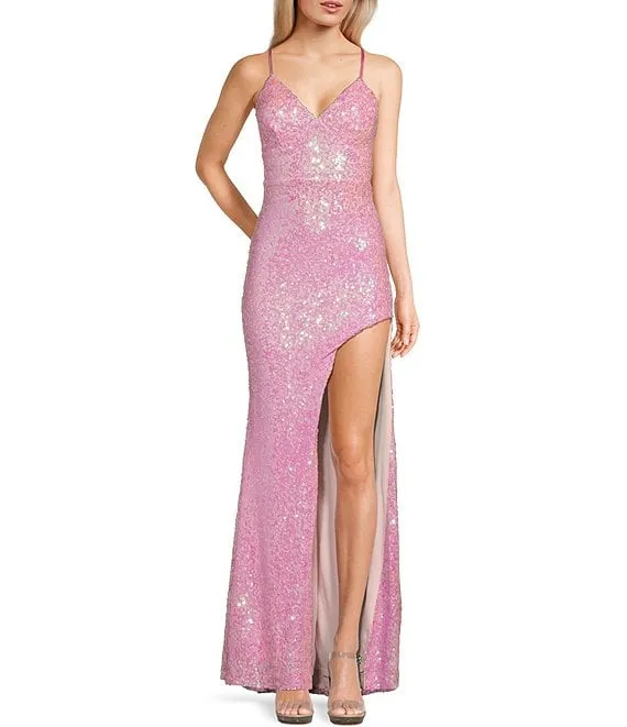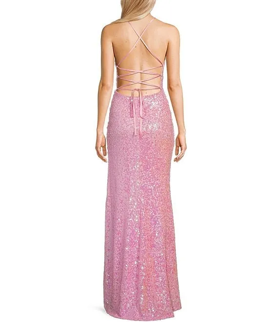 Sequin V-Neck Asymmetrical Hem Lace-Up Back Long Dress