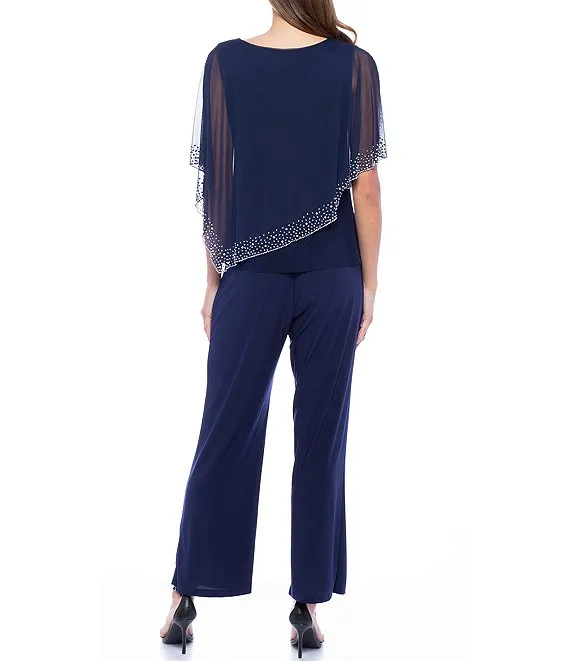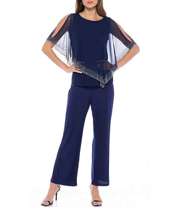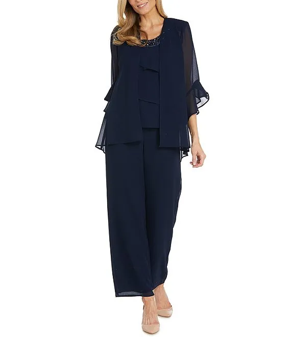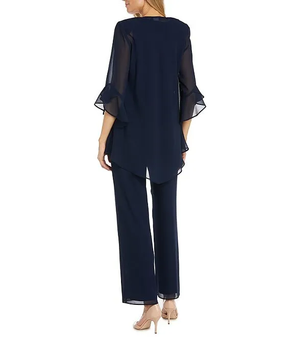 Envelope Tier 3/4 Sleeve Scoop Neck Pebble Georgette Chiffon 3-Piece Pantsuit Set