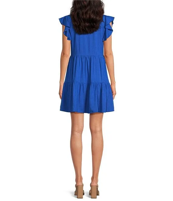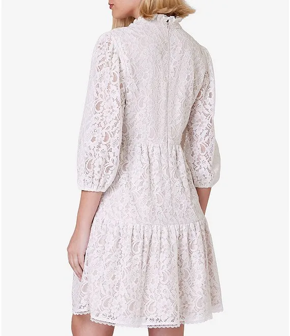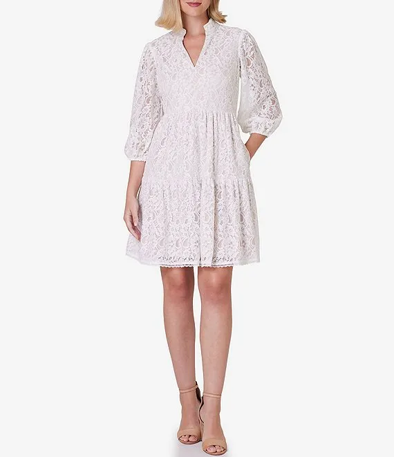 3/4 Sleeve Ruffle V-Neck Tiered Skirt Lace Dress