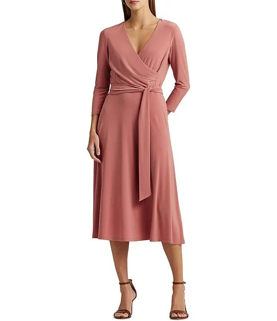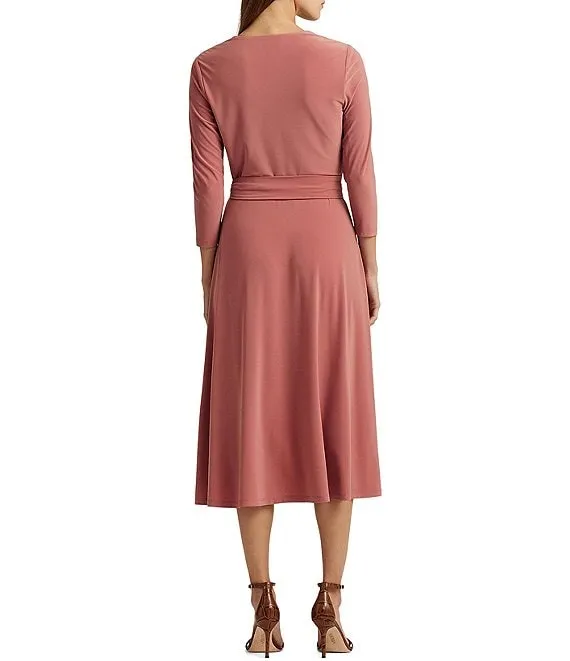 Lauren Ralph Lauren Stretch Faux Wrap Surplice V-Neck 3/4 Sleeve A-Line Midi Dress