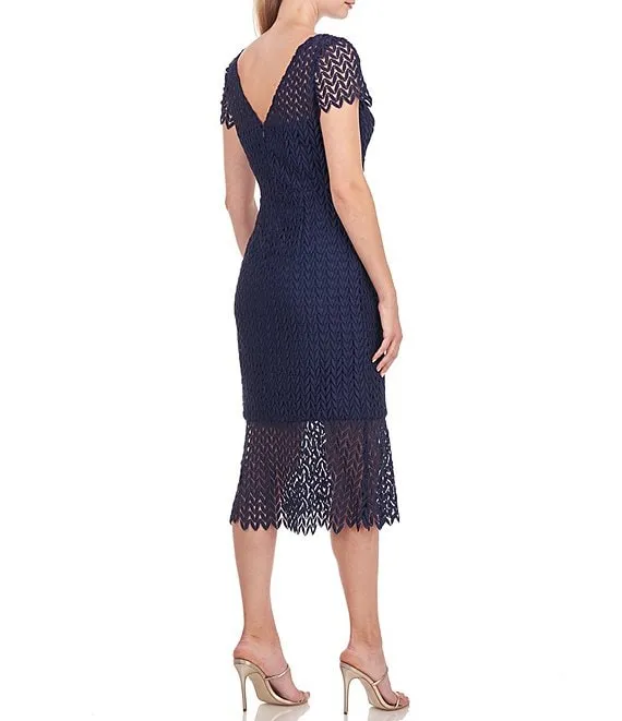 Flounce Hem Illusion Lace Short Sleeve Boat Neck Scalloped Midi Sheath Dress
