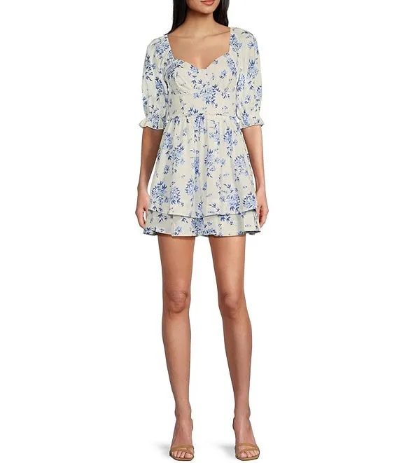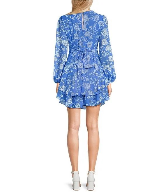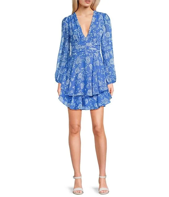 Floral Print Chiffon Long Sleeve V-Neck Shirred Waist Layered Skirt Dress