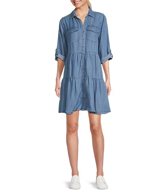 Long Sleeve Tiered Fit And Flare Printed Poplin Dress