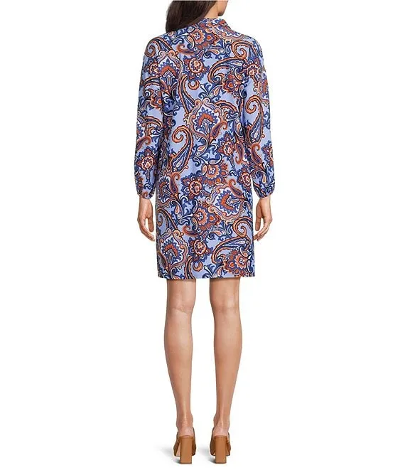 Florence Stretch Knit Palm Beach Paisley Bluebell Print Split V-Neck Long Sleeve Shift Dress