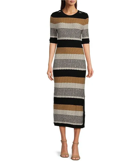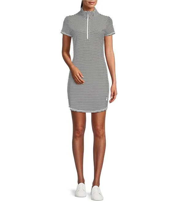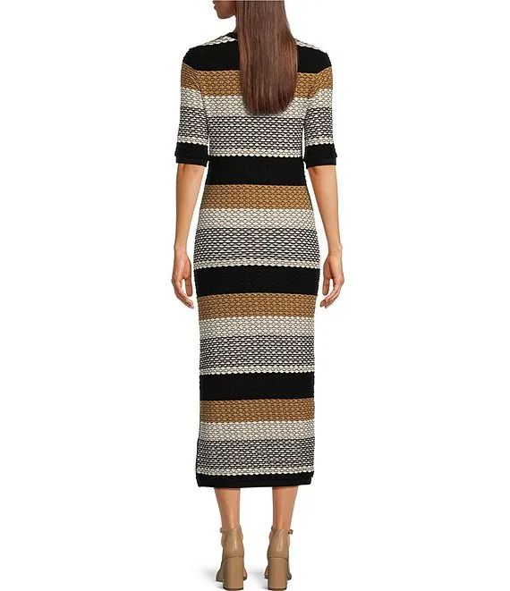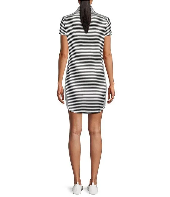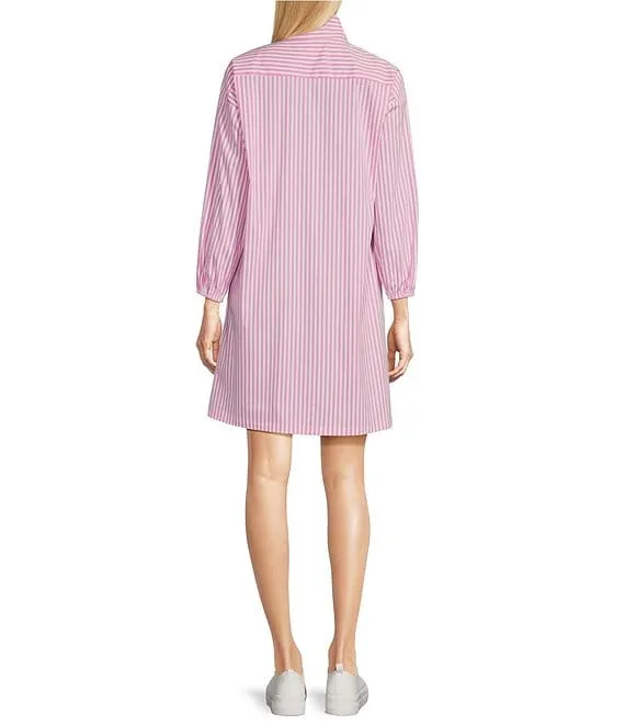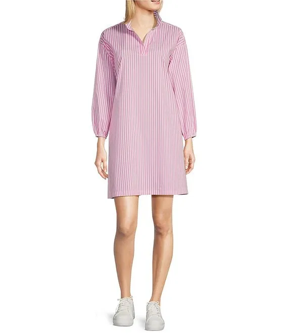 Florence Stretch Cotton Blend Striped Split V-Neck Long Sleeve Shift Dress