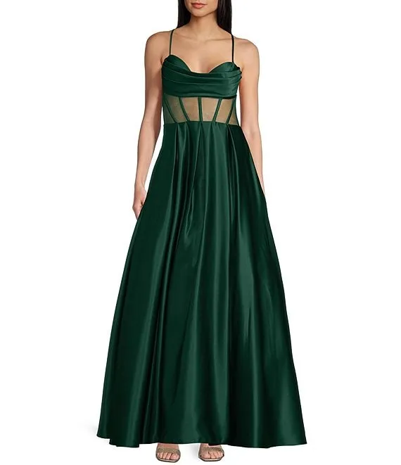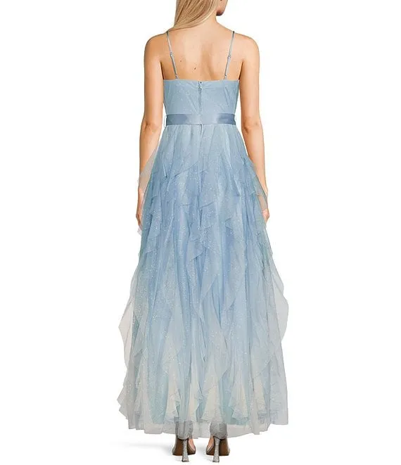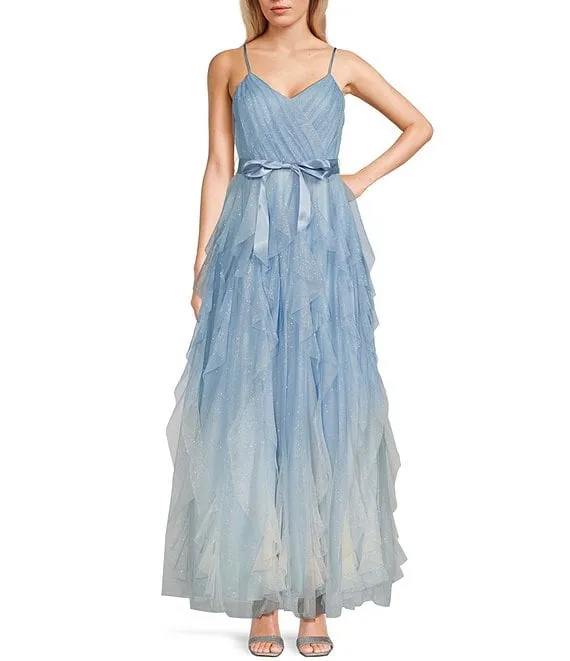 Spaghetti Strap V-Neck Glitter Ombre Mesh Corkscrew Ball Gown