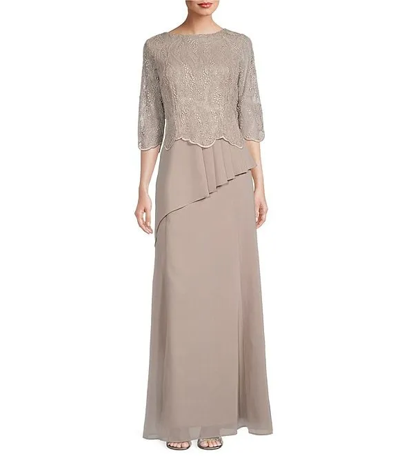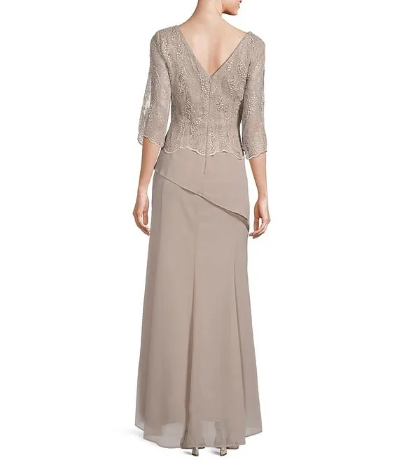 Georgette Embroidered Crew Neck 3/4 Sleeve Asymmetrical Hem Top Tiered Gown