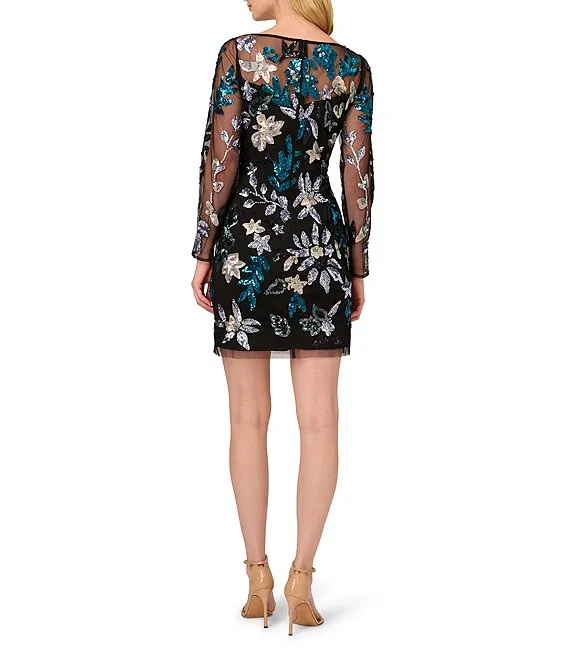 Adrianna Papell Beaded Illusion Boat Neckline Long Sleeve Sheath Dress