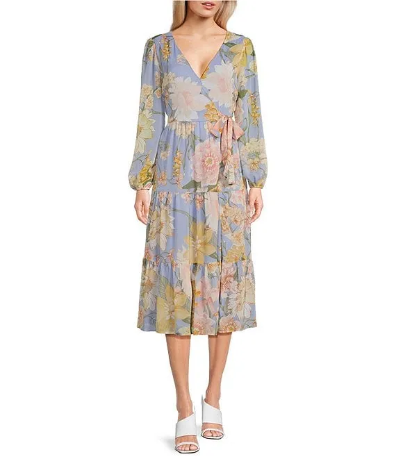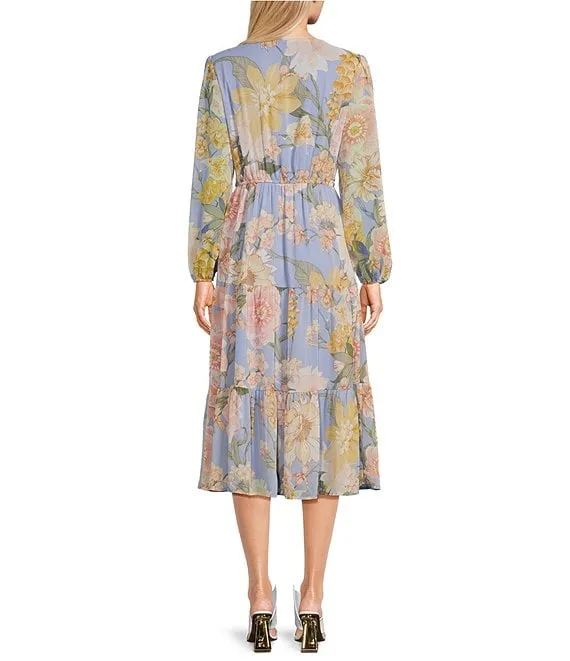 Floral Print Long Sleeve Side Tie Tiered Midi Dress