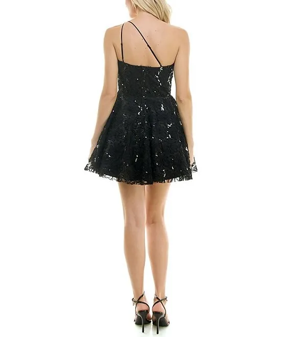 One Shoulder Sequin Fit-And-Flare Mini Dress