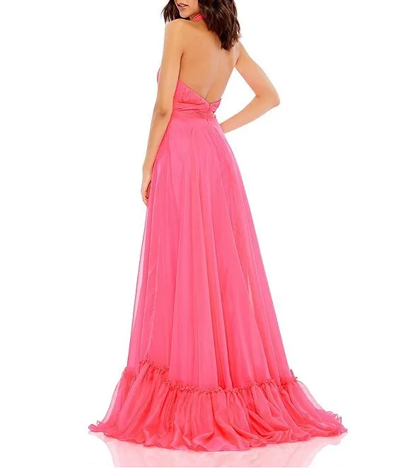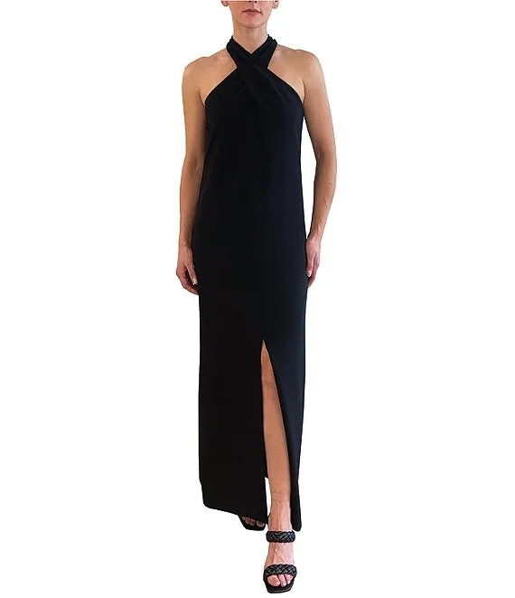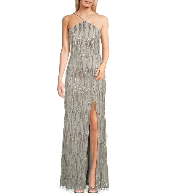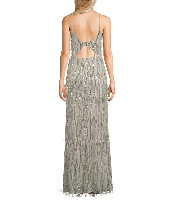 Sequin Fringe Back Cut-Out Front Slit Long Dress