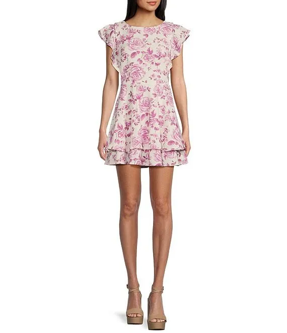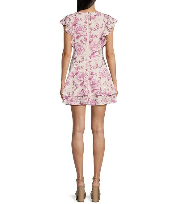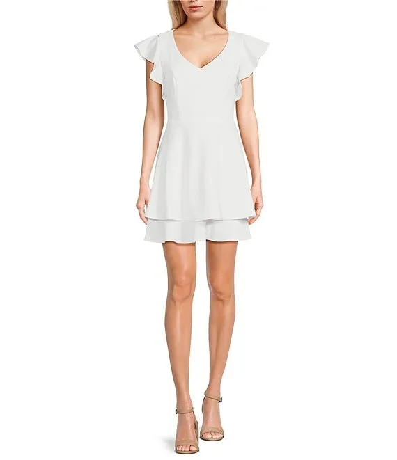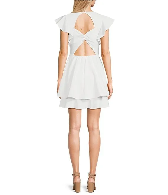 V-Neck Flutter Sleeve Twist Back Cut Out Double Tiered Mini Dress