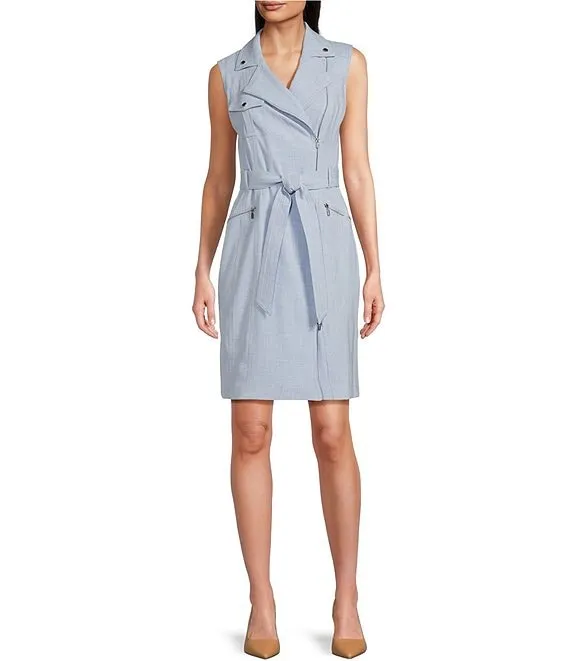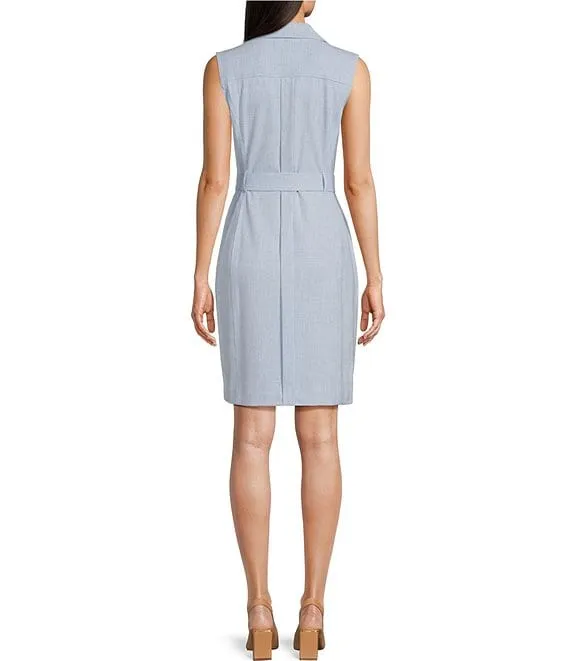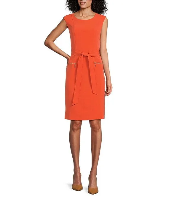 Kasper Stretch Crepe Sleeveless Belted Zipper Pocket Sheath Dress