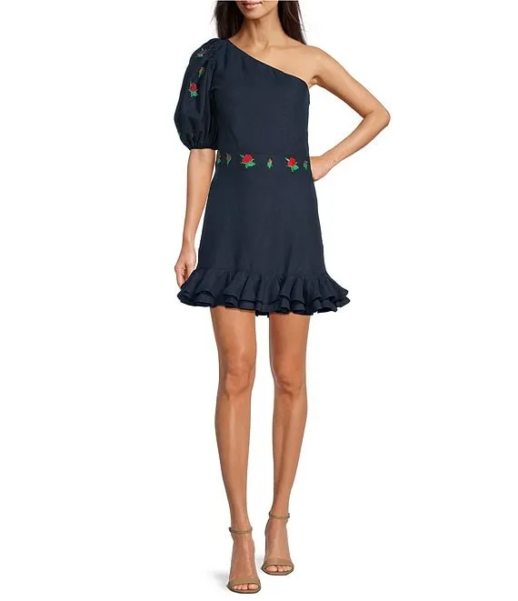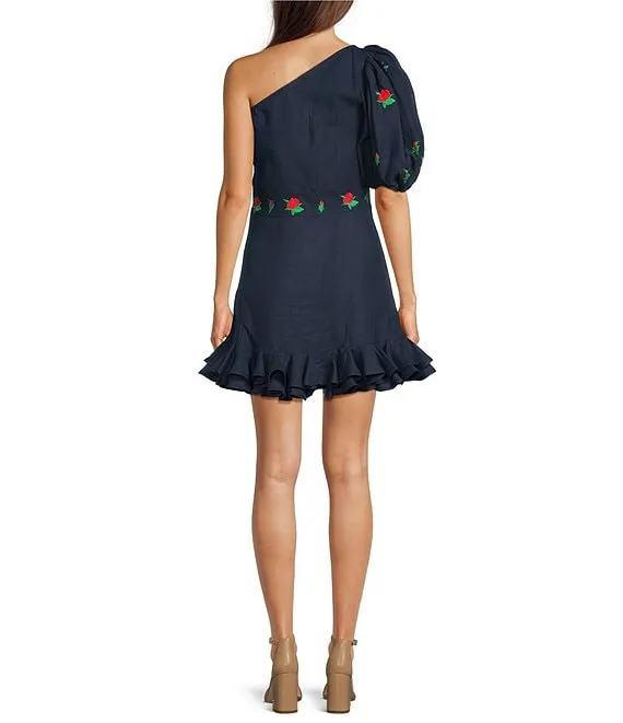 Flame Mini Linen One Sleeve Ruffle Hem Floral Embroidery Dress