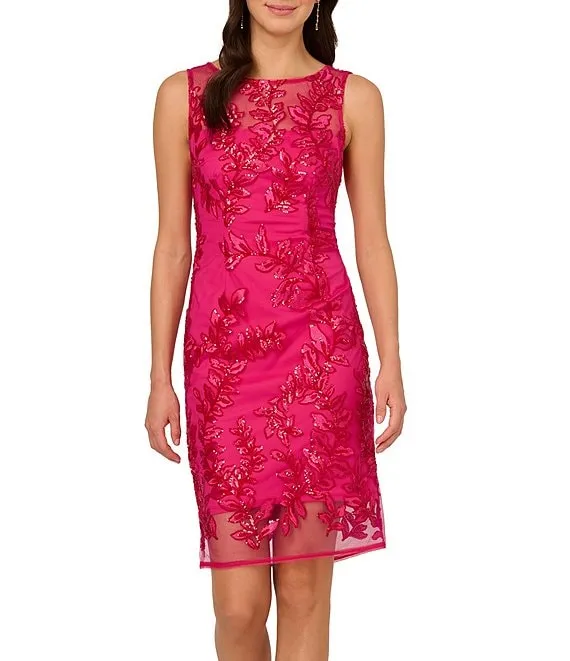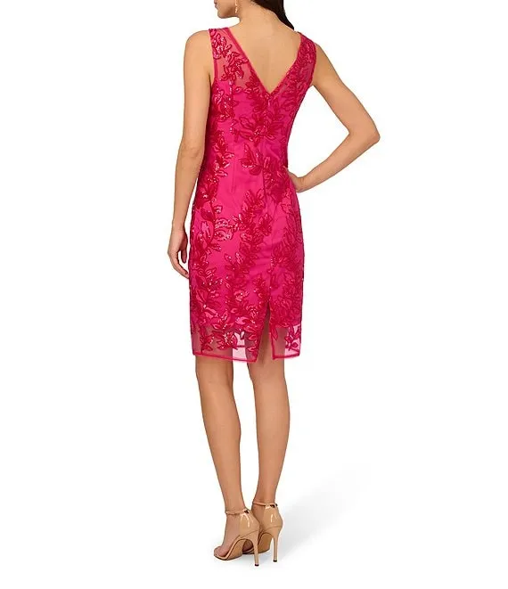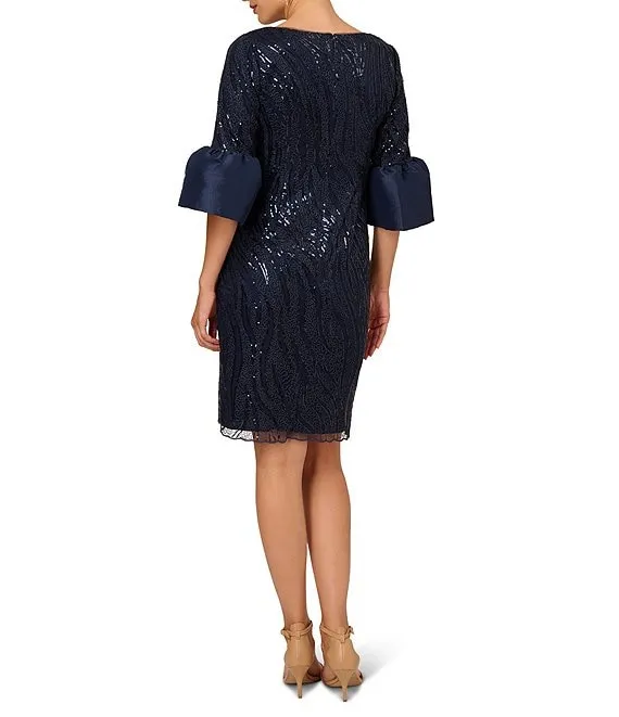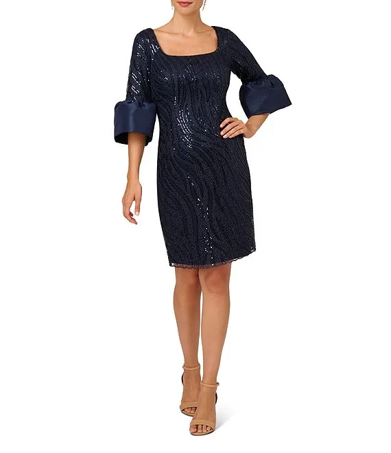 Adrianna Papell Square Neck 3/4 Bell Sleeve Sequin Embroidered Dress