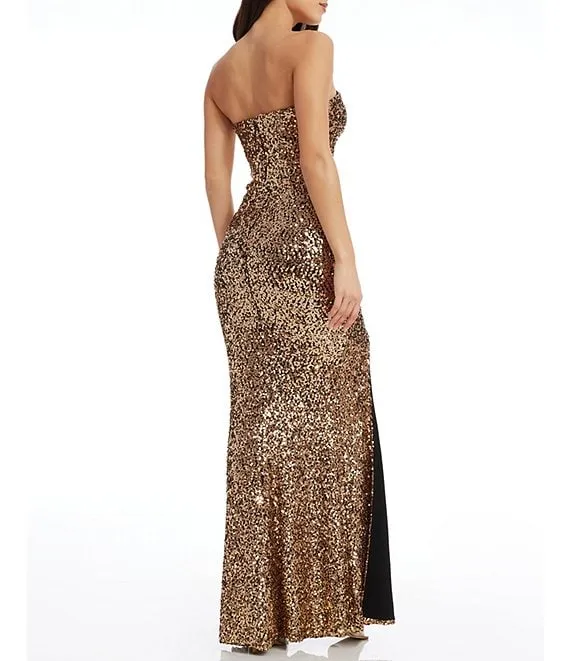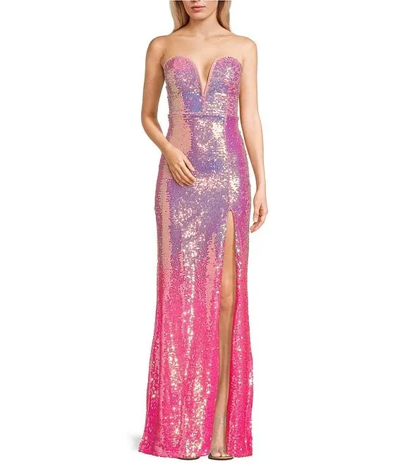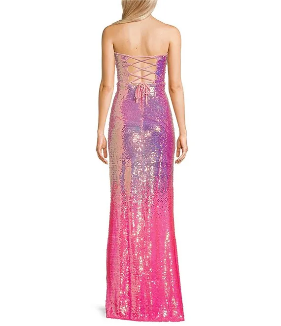 Strapless Ombre Sequin Lace-Up Back Front Slit Long Dress