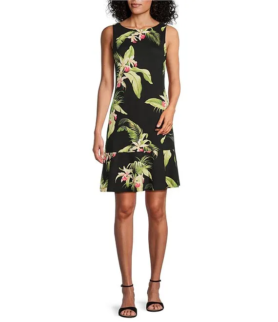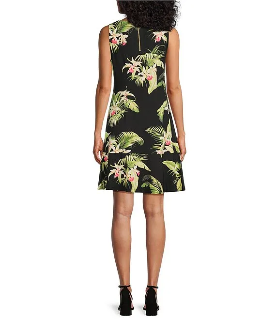 Tropical Floral Print Stretch Crew Neck Sleeveless A-Line Dress