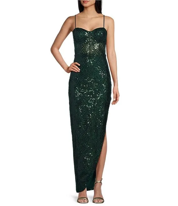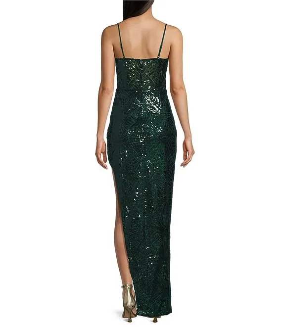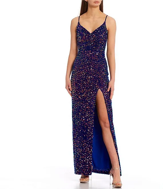 Sequin Front Slit V-Neck Long Dress