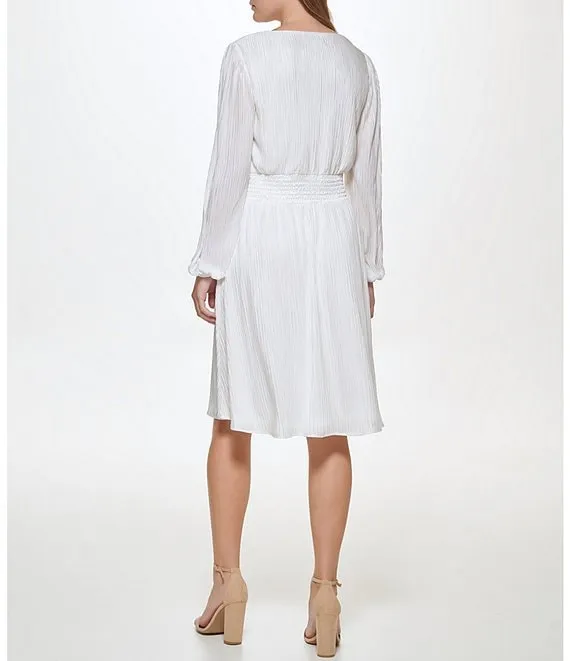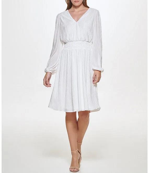 Long Puffed Sleeve Pleated Knit V-Neck Smocked Waist A-Line Dress