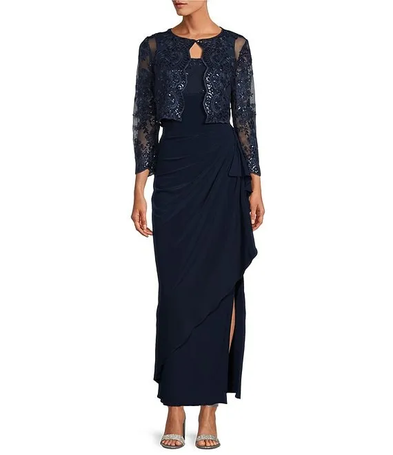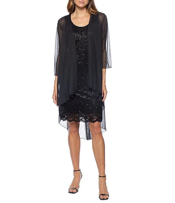 Sequin Lace Scoop Neck 3/4 Sleeve Sheath Chiffon Duster 2-Piece Jacket Dress