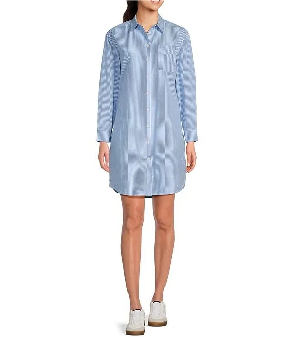 Cam Stripe Poplin Point Collar Long Sleeve Button Down Shirt Dress