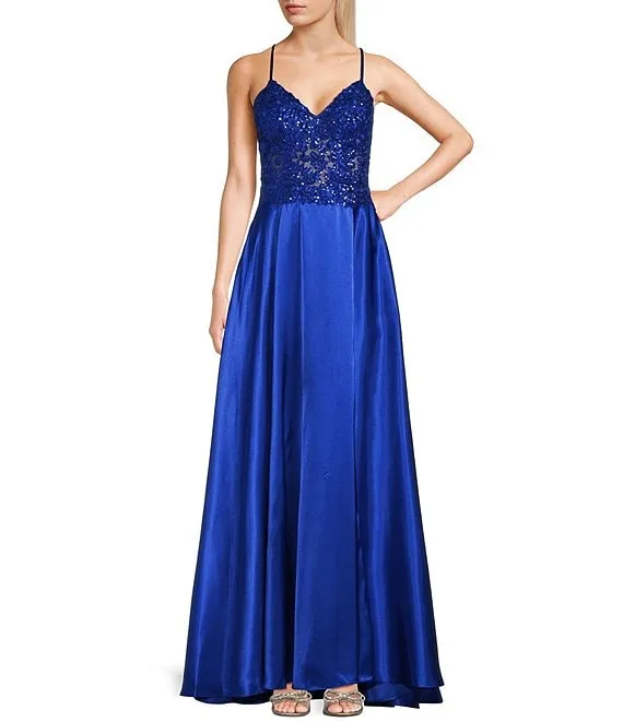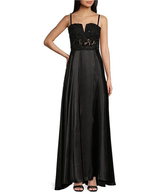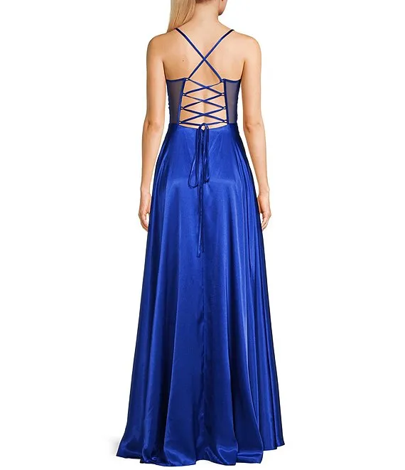 Illusion Embellished Corset Lace-Up Back Satin Ball Gown