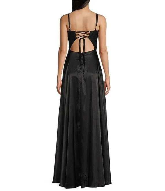 Illusion Lace Mesh Bodice Lace-Up Back Long Dress