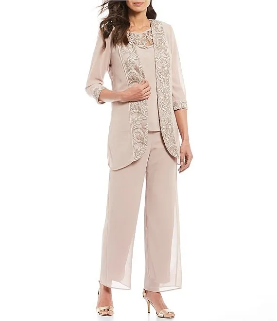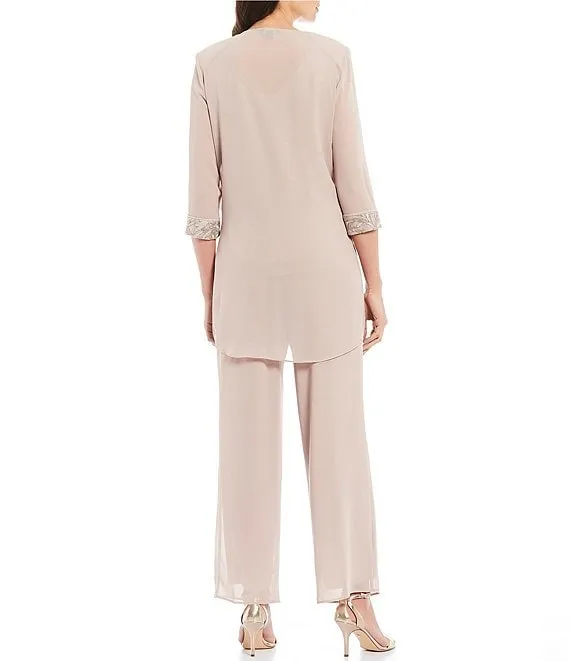 Round Neck 3/4 Sleeve Embroidered Trim Duster 3-Piece Pant Set