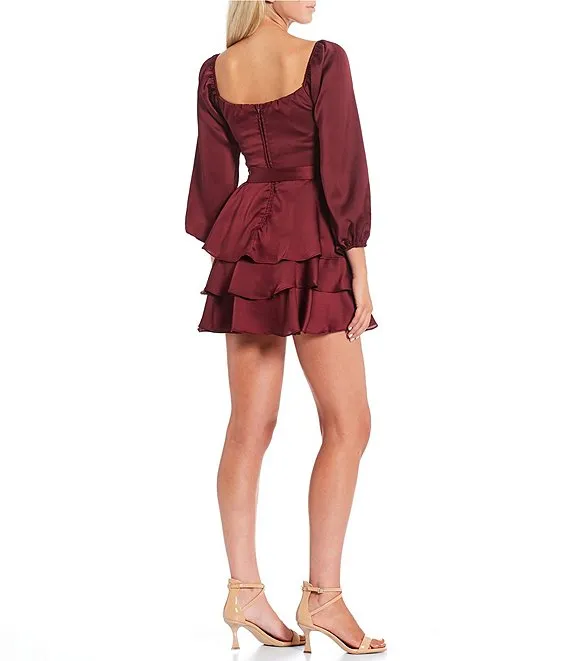 Long Sleeve Waist Tie Tiered Ruffle Satin Dress