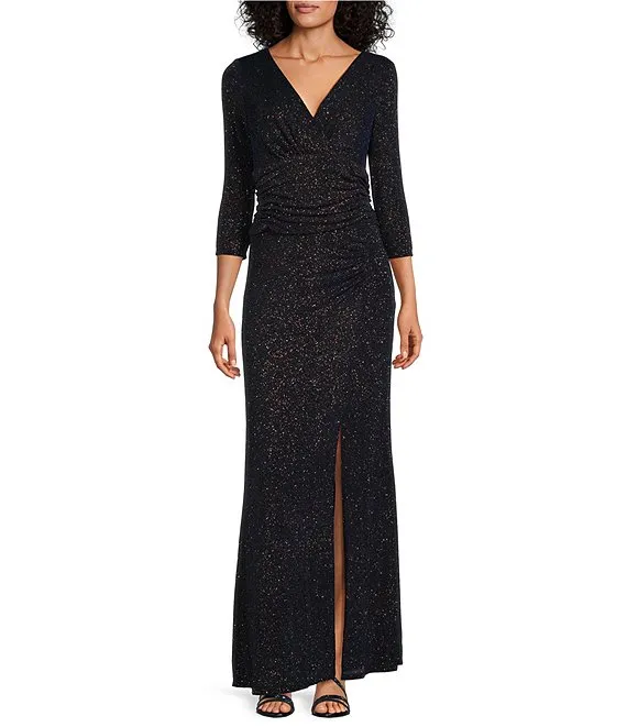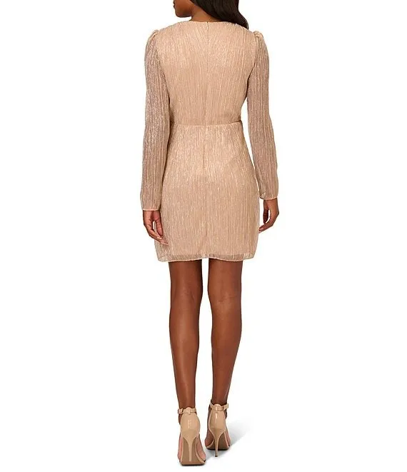 Adrianna Papell Long Sleeve Surplice V-Neck Metallic Crinkle Mesh Draped Dress