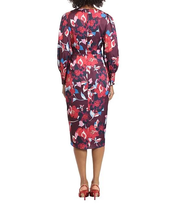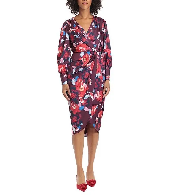 Floral Print Long Sleeve Surplice V-Neck Faux Wrap Dress
