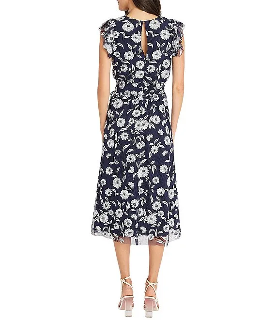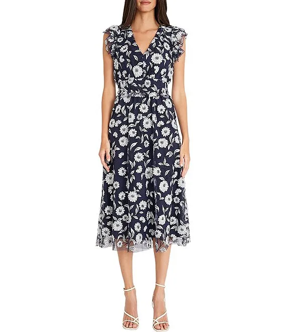 Embroidered V-Neckline Flutter Cap Sleeve Midi Dress