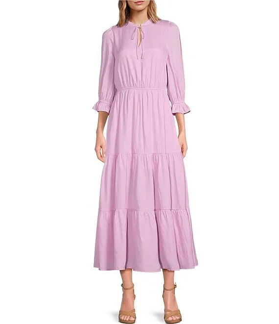 Split Tie Neck 3/4 Sleeve Tiered Ruffle Maxi Dress