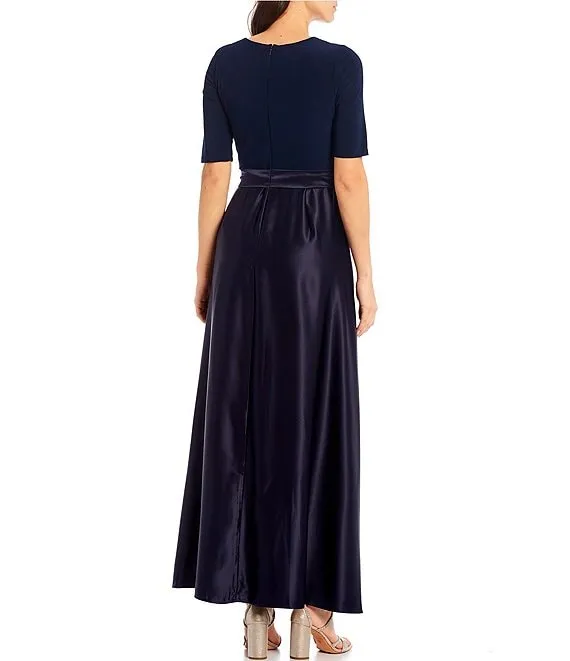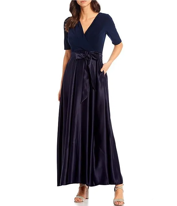 3/4 Sleeve V-Neck Tie Waist Satin Skirt Ball Gown