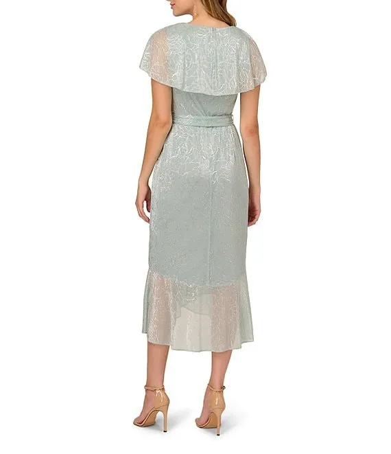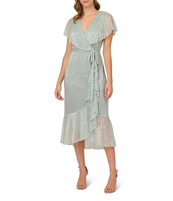 Adrianna Papell Metallic Faux Wrap Short Flutter Sleeve Midi Dress