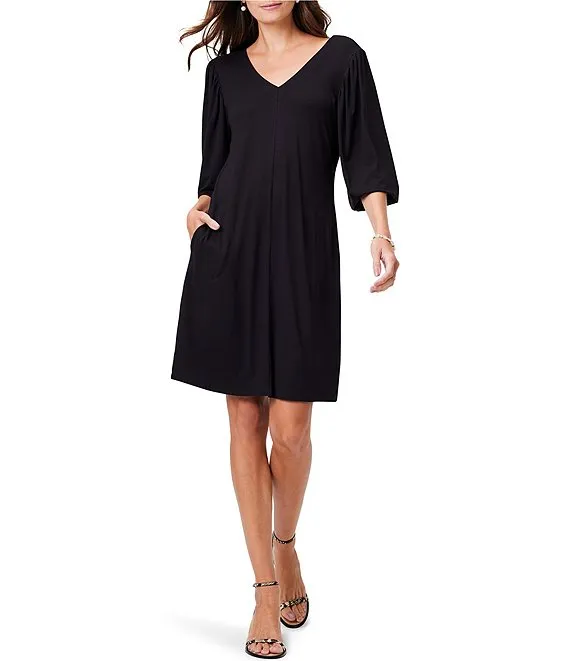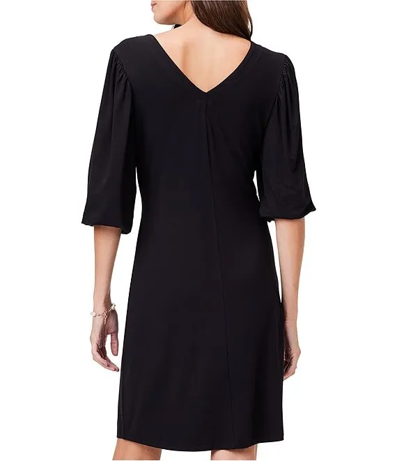 Knit Jersey V-Neck Femme Elbow Puff Sleeve A-Line Dress
