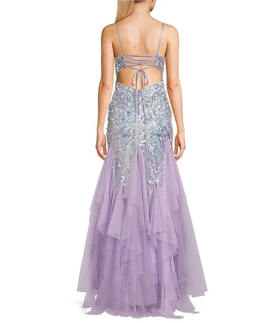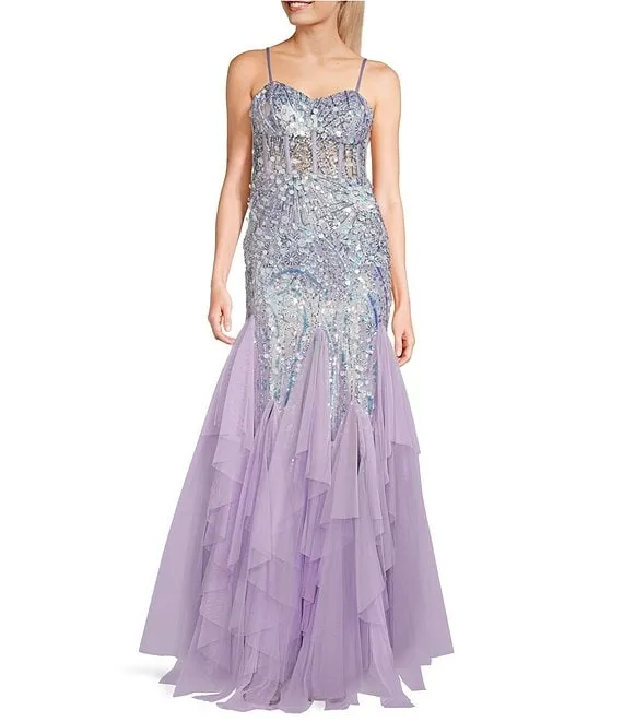 3D Sequin Sweetheart Neck Spaghetti Strap Mesh Corset Bodice Open Back Mermaid Gown